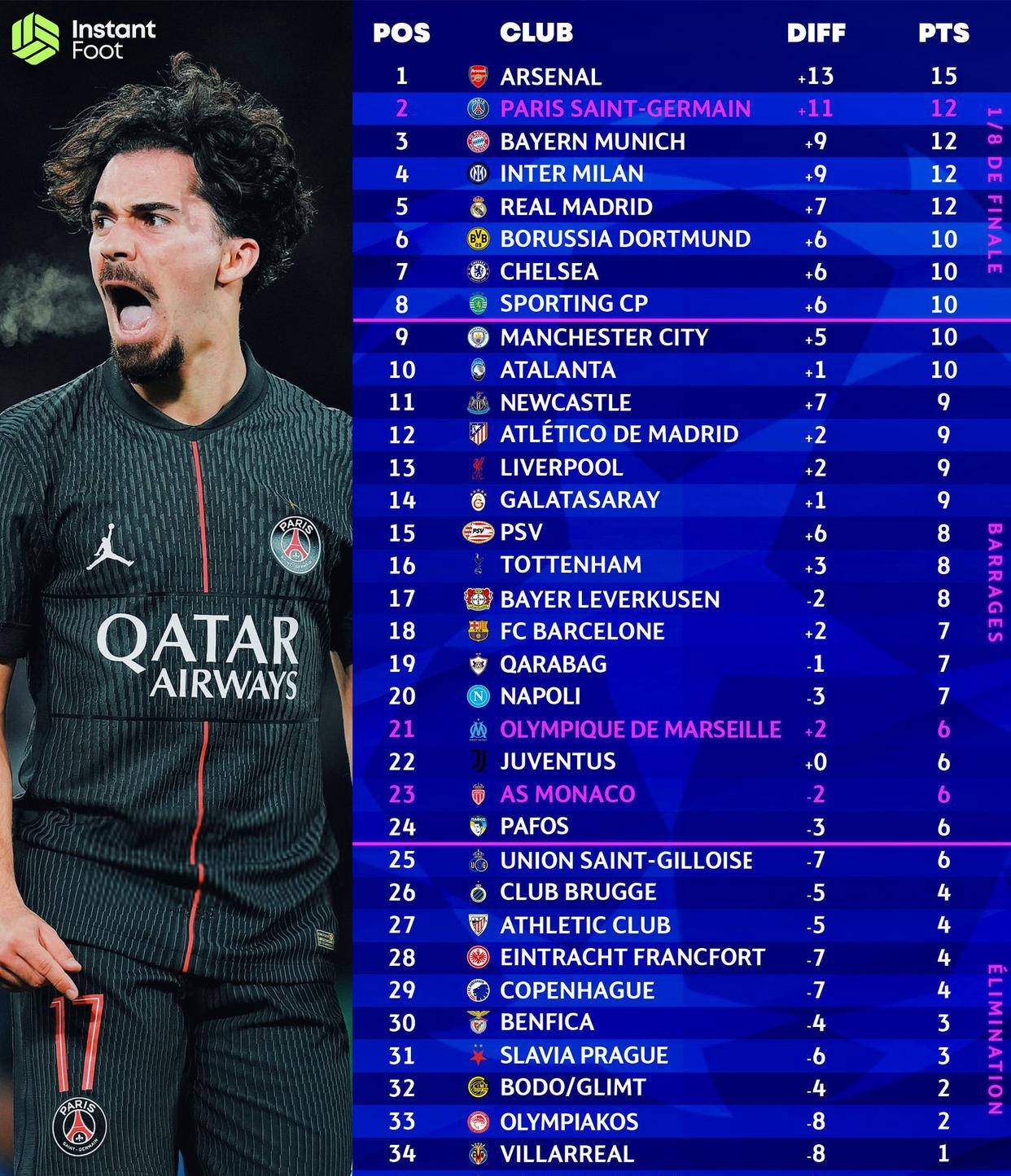 整体来看,小组前两名积分一般需要达到19至21分之间,进入前八(直接晋级16强)的门槛大约在16分左右,而具体最终的24个晋级名额如何分配,则存在一定变数。回顾上赛季,布鲁日仅凭11分就排在凯旋的第24名位置,本赛季预测甚至更加宽松,10分获得直接晋级资格的概率增大,这意味着积分要求或许取消了过往的绝对门槛。这也让各队的争夺更具悬念。